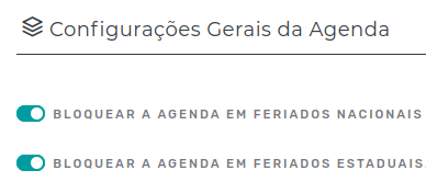 As duas primeiras opções desta seção dizem respeito a bloquear, ou não a agenda em feriados nacionais ou estaduais. No exemplo abaixo ambos estão bloqueados (para garantir que os bloqueios de feriados estatuais funcionem, não esqueça de completar seu endereço no cadastro.