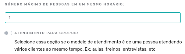 A próxima opção é referente ao número máximo de pessoas que podem ser atendidas em um mesmo horário e isto dependerá do número de atendentes que você tem. Caso seu atendimento seja em grupo, por exemplo para aulas com 10 alunos por sala, digite “10” e marque a opção “ATENDIMENTO PARA GRUPOS”.