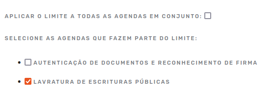 Na tela de configuração de limites, preencha o formulário com as opções de configuração, as quais serão descritas em seguida (figuras abaixo). A primeira opção é sobre se esses limites são aplicados a todas as agendas, se sim, marque “APLICAR O LIMITE A TODAS AS AGENDAS EM CONJUNTO”, caso você queira aplicar esse limite a agendas específicas, selecione quais agendas na lista. No exemplo abaixo temos duas agendas e selecionamos apenas a de “LAVRATURA DE ESCRITURAS PÚBLICAS”.