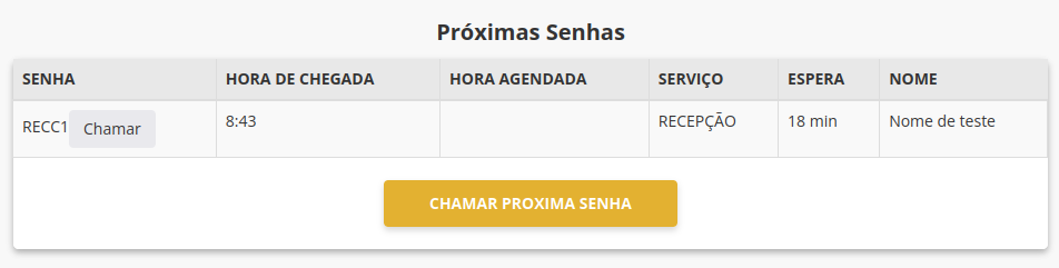 Logo depois, veja que a tabela de próximas senhas mostra os clientes que estão aguardando, você deve clicar em chamar próxima senha para chamar o próximo cliente.